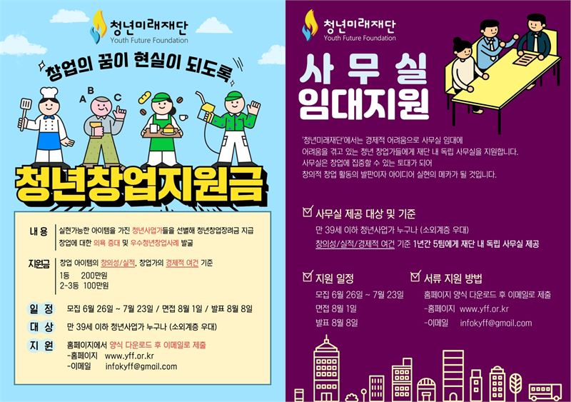 '2023년 청년미래재단 청년창업지원금 사업'은 백만원 2명과 이백만원 1명의 창업지원금을 지급하며, '2023년 청년미래재단 사무실 임대 지원 사업'은 1년 동안 5팀에게 재단 내 독립 사무실을 제공한다.