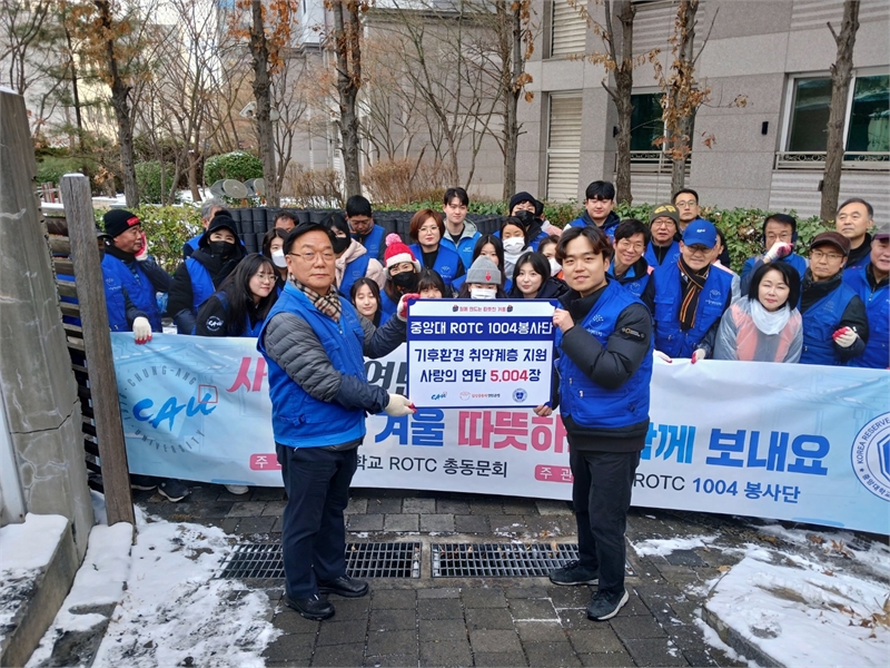 중앙대학교ROTC 1004 봉사단(단장 오병하)이 지난 12월 6일 서울 동작구 정금마을에서 ‘함께 따뜻한 겨울나기’ 연탄 나눔 봉사활동을 진행했다. 이번 봉사에는 중앙대 ROTC 동문과 총학생회, 현대병원 재난의료봉사단, 동작구 자원봉사센터 등 총 44명이 참여했으며, 취약계층 8가구에 연탄 2,000장(가구당 250장)을 배달했다.