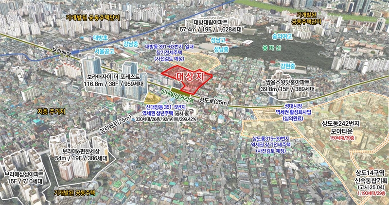 대방동 일대는 노후 저층 주거지가 밀집해 있고, 도로 폭이 좁고 단절되는 등 기반시설이 전반적으로 열악한 지역으로 꼽혀 왔다. 이에 구는 체계적인 개발을 위해 지난 2023년 해당 지역을 ‘동작구형 정비사업’ 시범사업지로 선정하고, 지역 여건에 적합한 역세권 활성화 사업 방식을 주민들에게 제안해 대상지 선정을 이끌어냈다.
