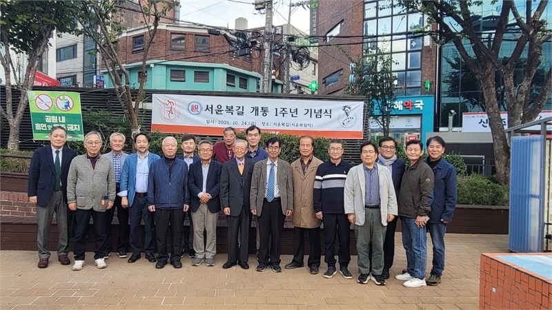 지난 24일 서울 마포구 이대입구역 앞 서윤복쉼터에서 ‘서윤복길 개통 1주년 기념행사’가 열렸다. 이날 행사에는 서윤복기념사업회 오천진 회장(수빈운수 대표)과 숭문중·고 동문 및 지역주민 등 관계자들이 참석해 대한민국 마라톤 영웅 고(故) 서윤복(1923~2017) 선수를 추모했다. ‘서윤복길’은 이대입구역에서 대흥역까지