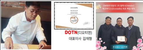 서울시 가산동에 소재한 GM대우자동차 1차 벤더인 디오티앤은 2023년부터 ESG경영을 단계적으로 도입하고 글로벌 공급망관리 에코바디스(EcoVadis) 인증 취득을 위한 부단한 노력으로 코바디스(EcoVadis) 브론즈 메달을 GM대우자동차 1차 벤더에서 유일하게 획득했다.
