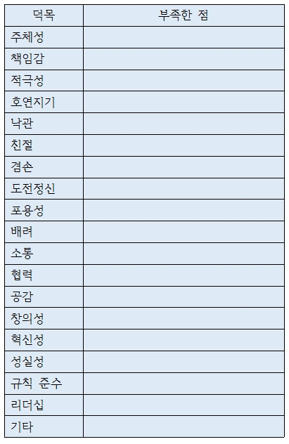 제시한 덕목들에 대하여 자신의 태도를 성찰해 보자. 덕목들은 긍정심리학(마틴 셀리그만) 등의 책에서 제시한 항목을 참고했다.
