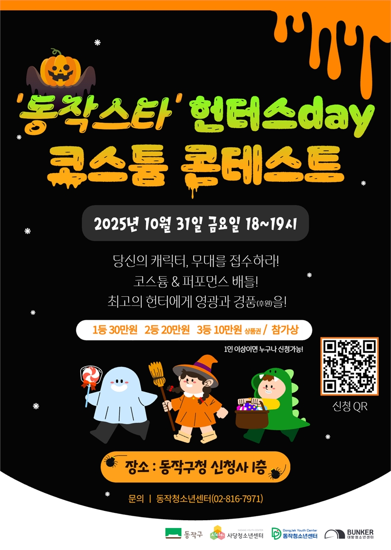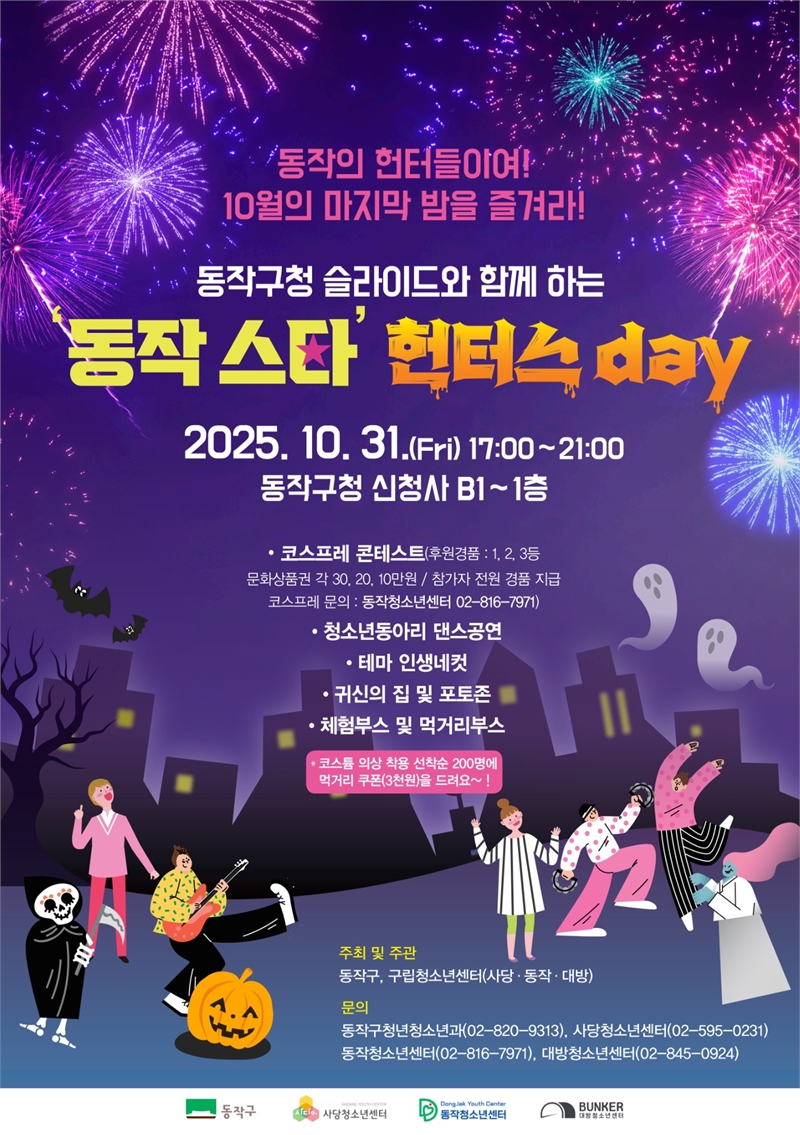 동작구(구청장 박일하)가 오는 10월 31일 오후 5시부터 9시까지 구청 신청사에서 청소년이 직접 기획하고 운영하는 제1회 핼러윈 축제 ‘동작 스타 헌터스day’를 개최한다고 밝혔다.