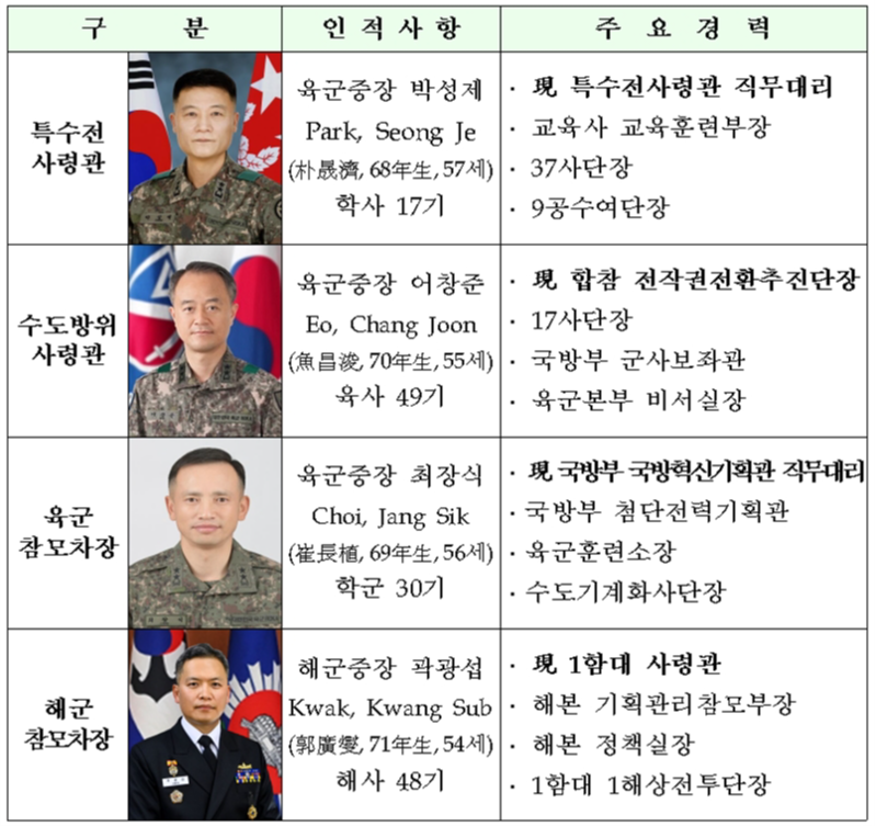 군은 이번 인사에서 기존의 작전 특기 중심 선발 기조에서 벗어나, 군수·인사·전력 등 다양한 분야의 인원을 군단장급 지휘직에 기용해 특기 다양화를 확대했다고 밝혔다.